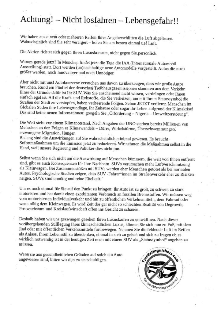 Das Schreiben stammt offenbar von einer radikal-ökologistischen Gruppierung („Tyre Extinguishers“). Es versucht, Sachbeschädigung und Eingriffe in fremdes Eigentum mit angeblichem „Klimaschutz“ zu rechtfertigen. Dabei werden ideologische Kampfbegriffe wie „Luxuskonsum“, „SUV-Fahrer*innen“ oder „Degrowth“ genutzt. Besonders gefährlich ist, dass die Verfasser ihre Straftaten offen bekennen und sie als „notwendige Maßnahmen“ darstellen, obwohl es sich in Wahrheit um kriminelle Sachbeschädigung und Nötigung handelt.